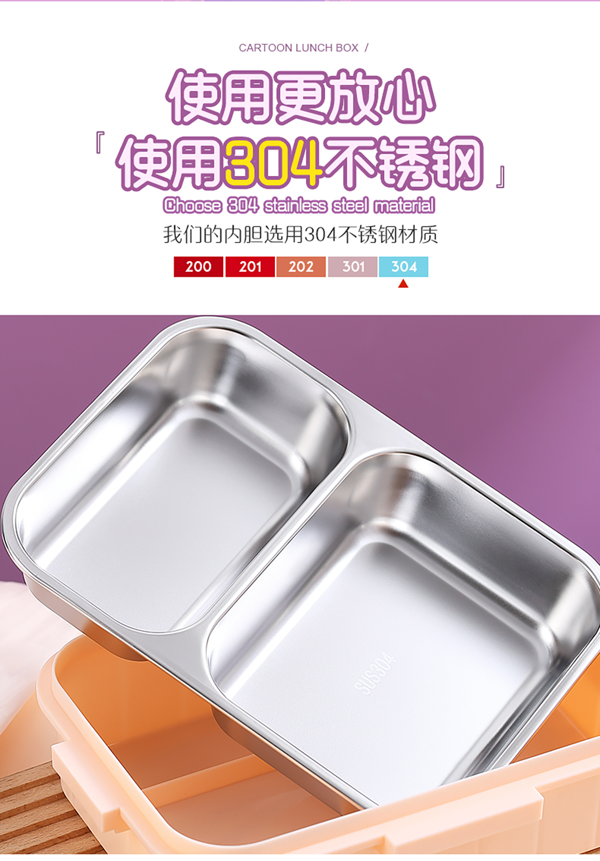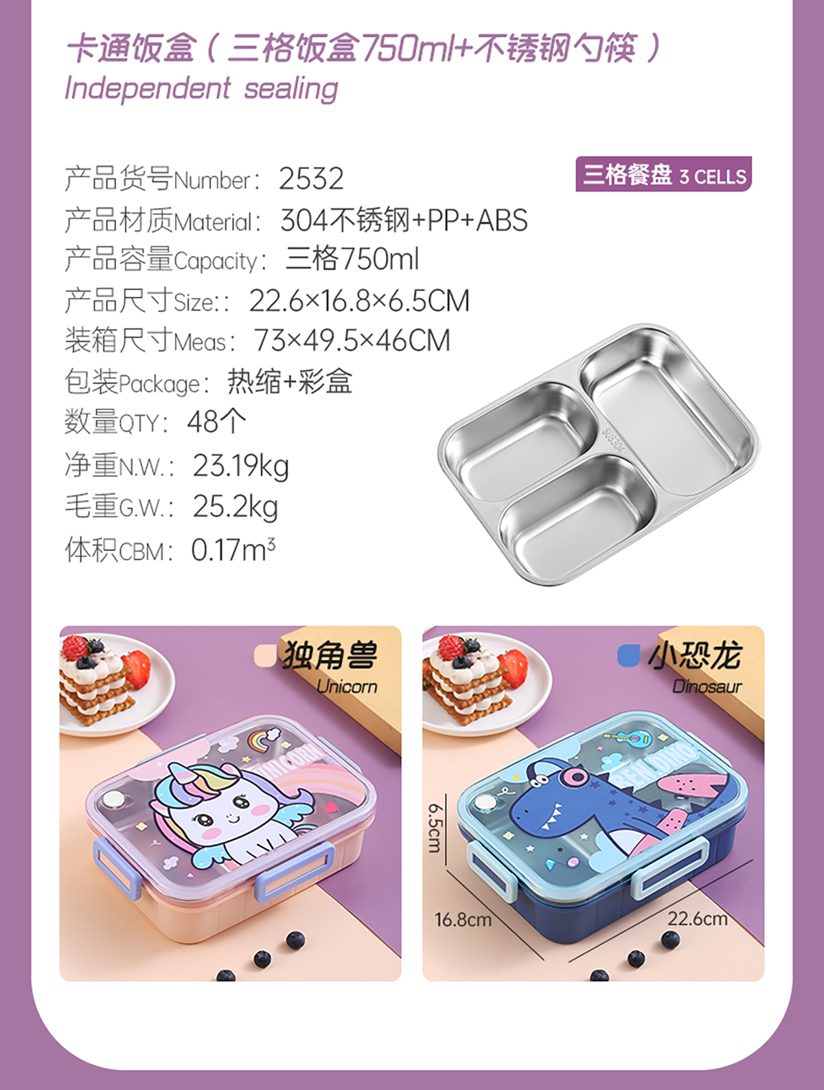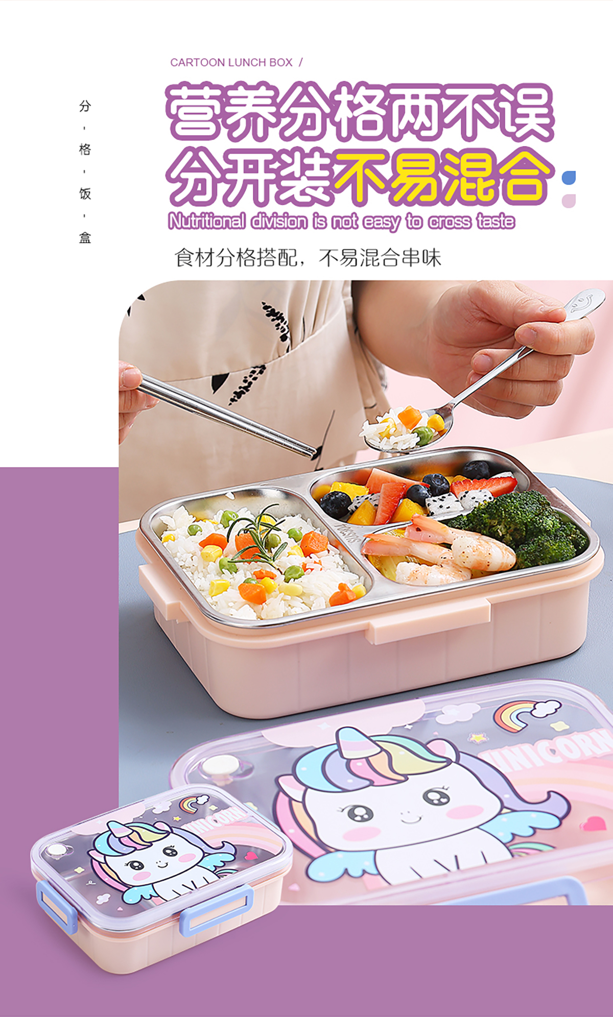 750ml/800ml獨(dú)立密封不銹鋼餐盒(卡通三格/二格+不銹鋼勺筷)