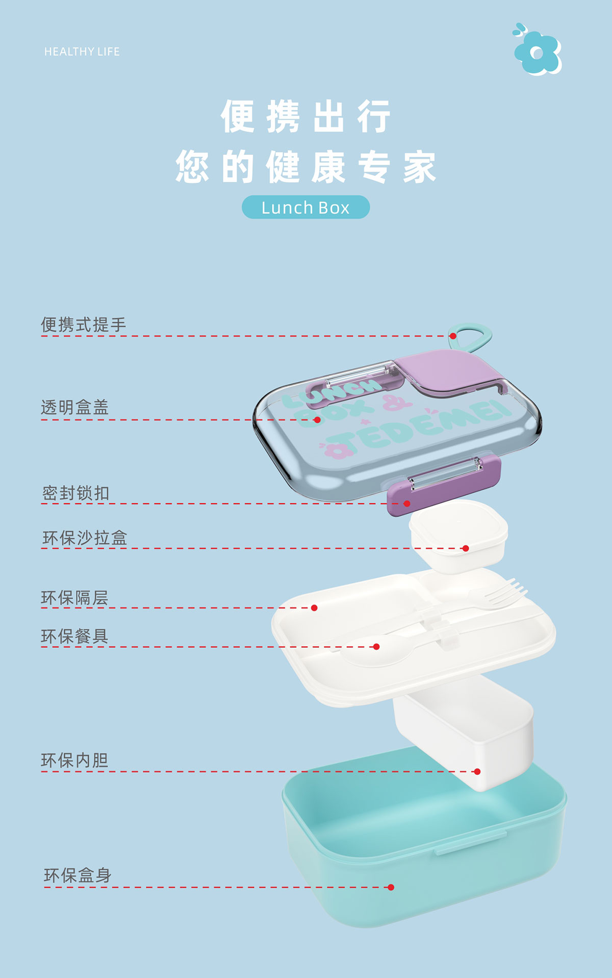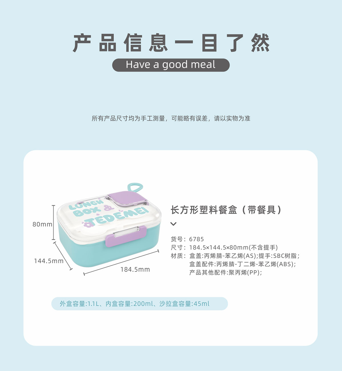 Size: 185*145*80mm/外盒:1.1L/內(nèi)盒:200ml/沙拉盒:45ml