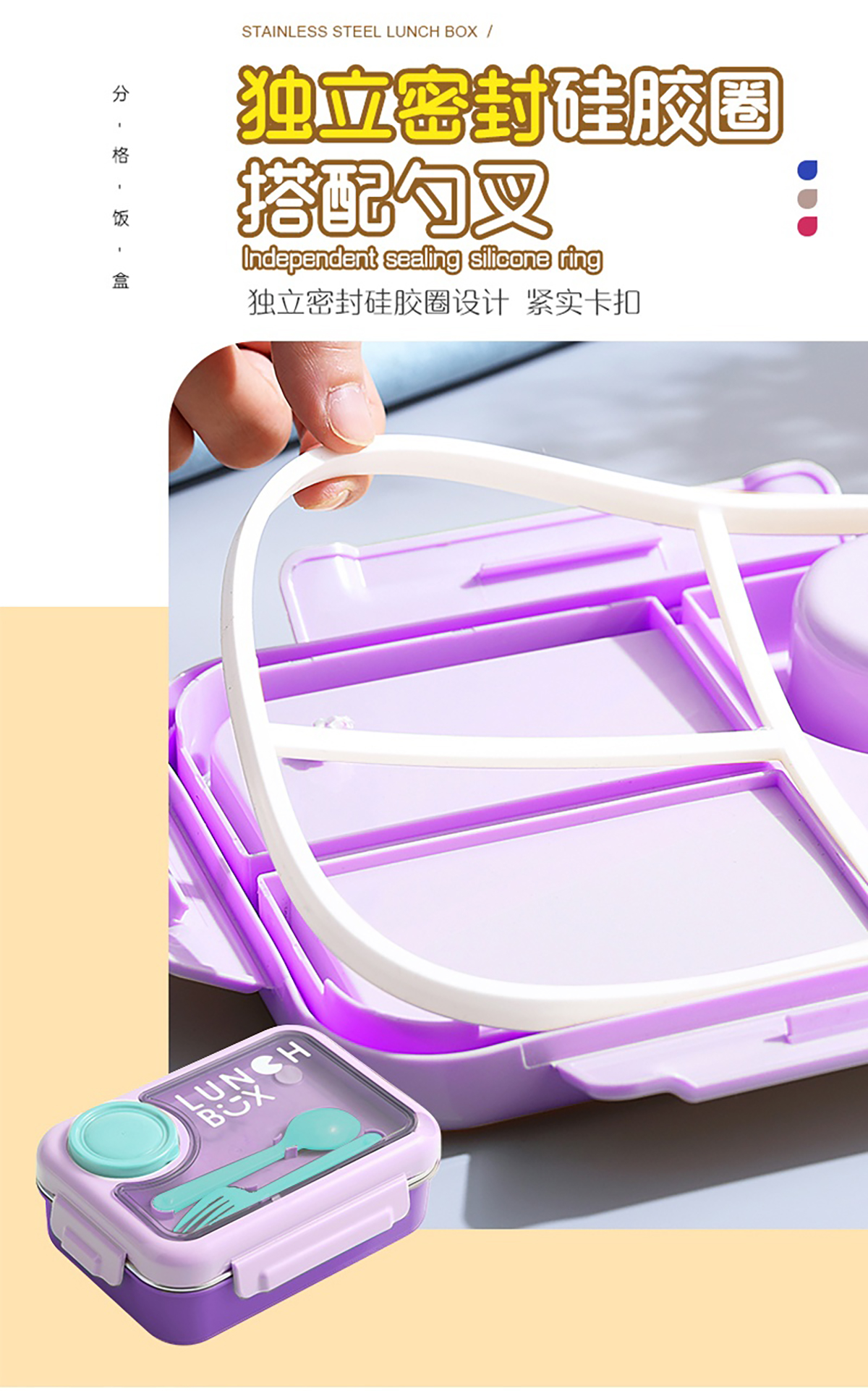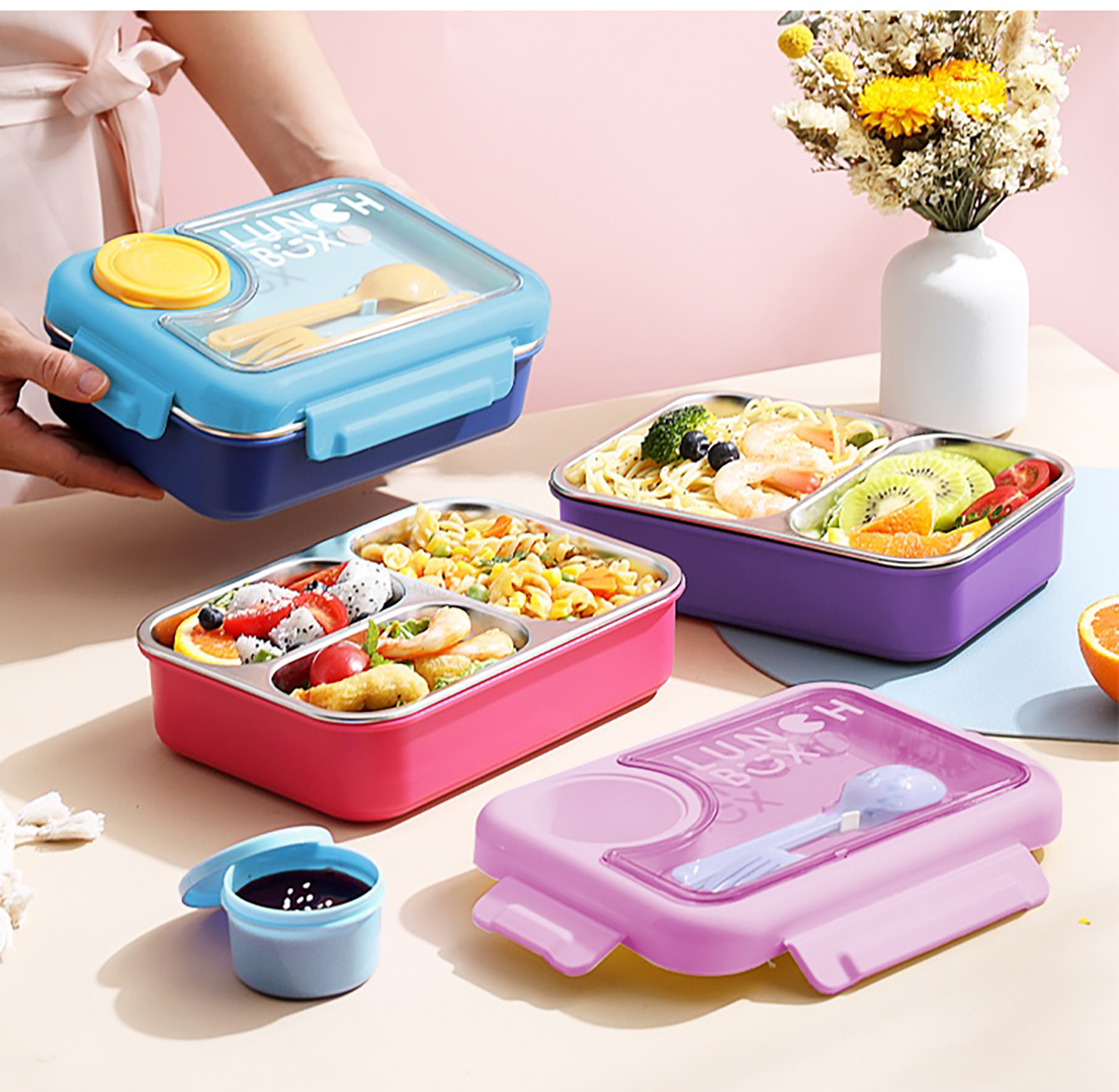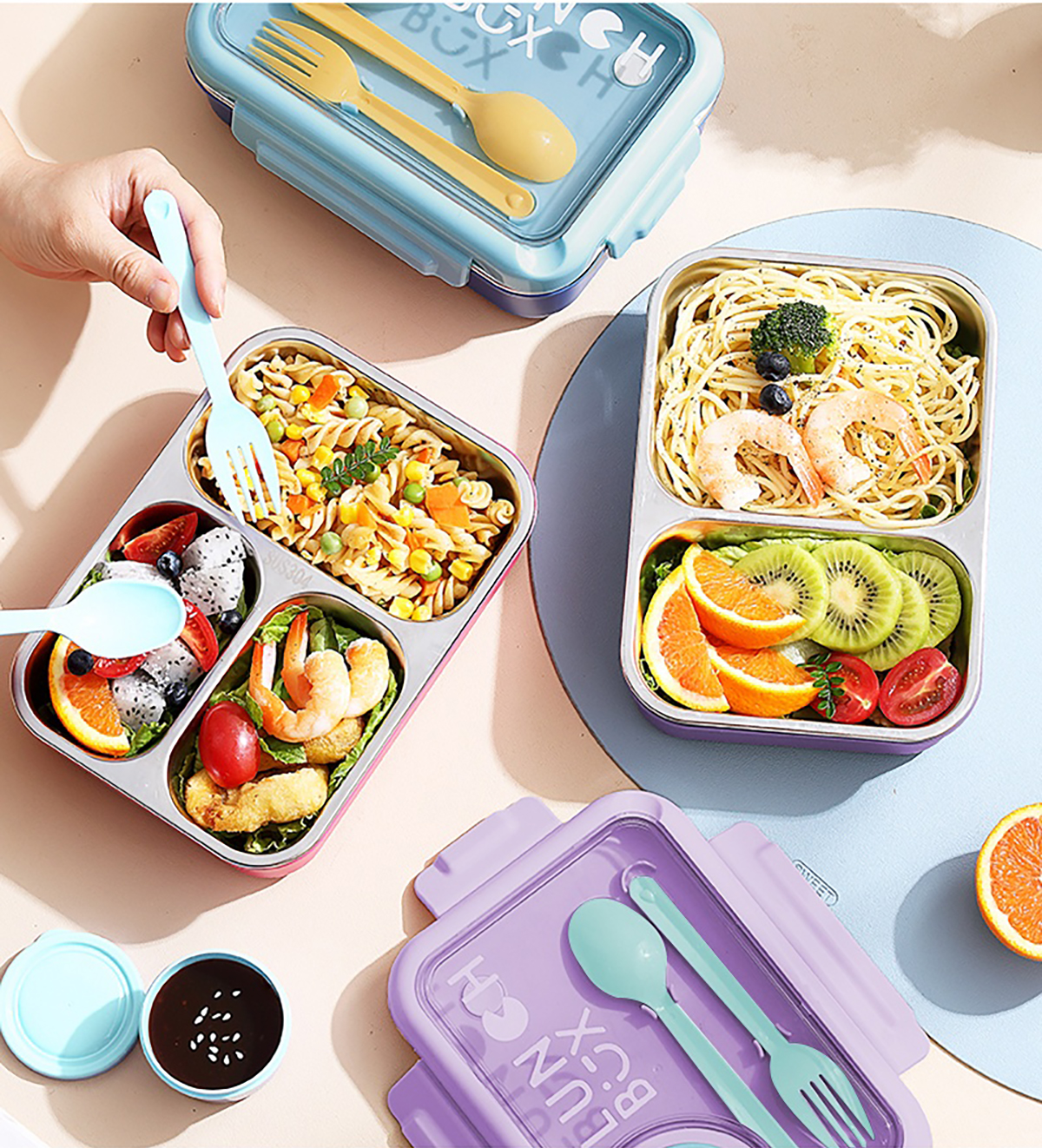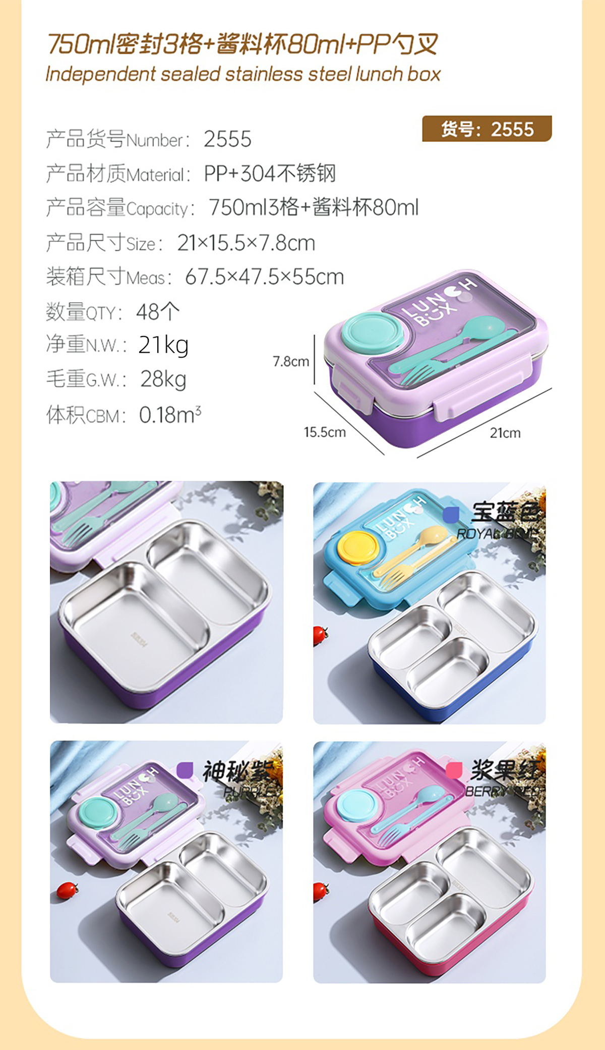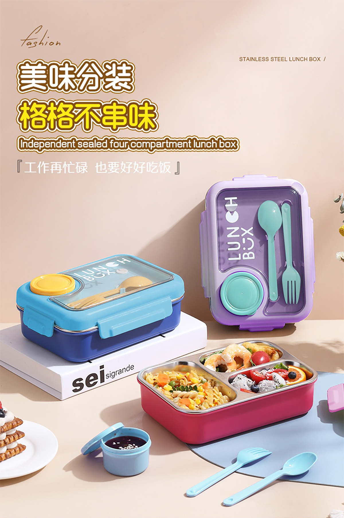 750ml獨(dú)立密封不銹鋼餐盒2格/3格+醬料杯80ml+PP勺叉